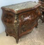 Antique French Style Commode, marble top, brass ormolu, lady and gent figurines, inlaid design, veneer (some crackling, missing pieces), three drawers, 39"h. 47'w., 22"d. Antique French Style Commode, marble top, brass ormolu, lady and gent figurines, inlaid design, veneer (some crackling, missing pieces), three drawers, 39"h. 47'w., 22"d.