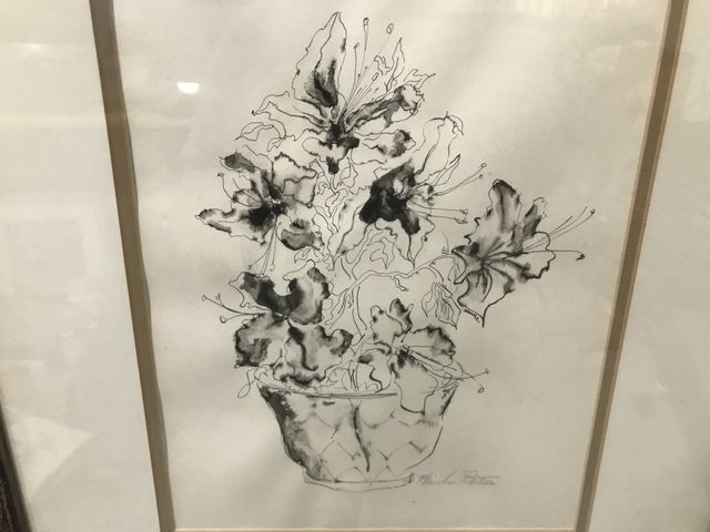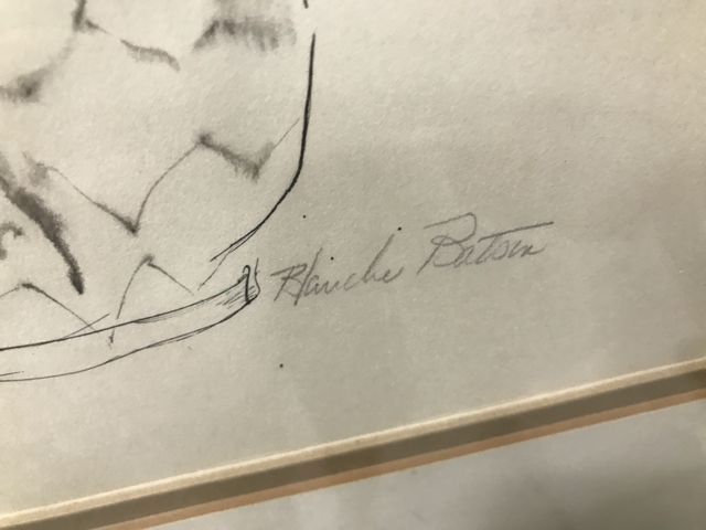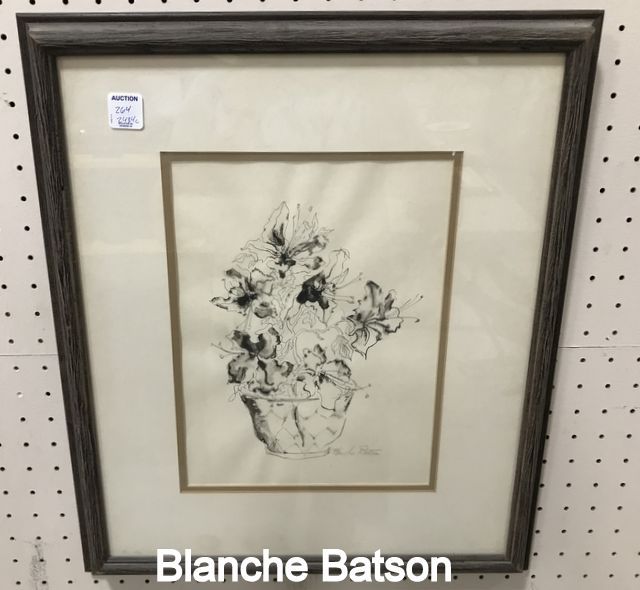 Blanche Batson Pen and Watercolor Still Life Flowers, pencil signed, matted, Born in Roseland, Mississippi, teacher, artist, was married to Blair Batson, frame is 20"h., 17"w. paper has some wrinkles. Blanche Batson Pen and Watercolor Still Life Flowers, pencil signed, matted, Born in Roseland, Mississippi, teacher, artist, was married to Blair Batson, frame is 20"h., 17"w. paper has some wrinkles.