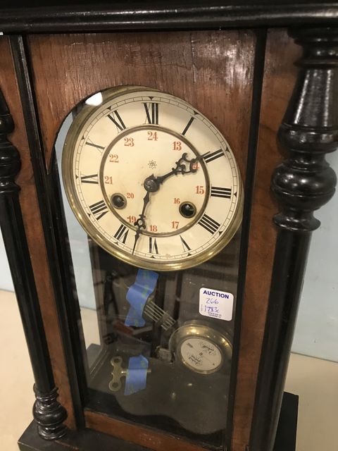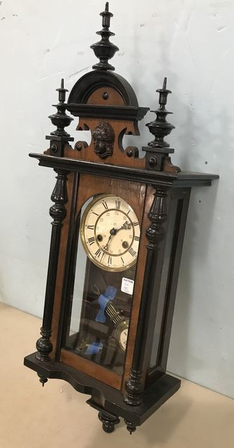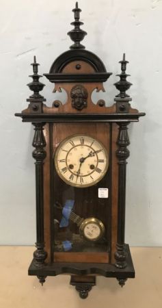 Antique Junghans German Walnut Wall Clock, R & A pendulum, has key, glass door, portrait emblem, has crest, good condition, 33"h., 11"w. Antique Junghans German Walnut Wall Clock, R & A pendulum, has key, glass door, portrait emblem, has crest, good condition, 33"h., 11"w.