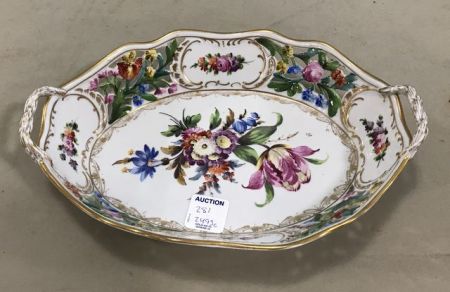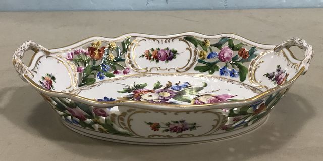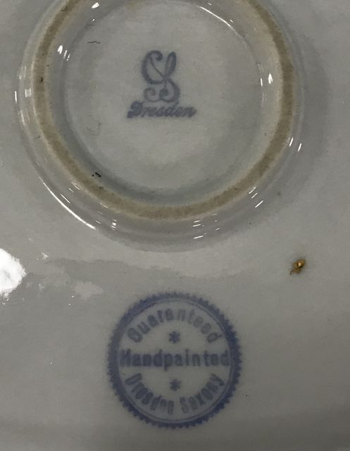 Dresden Hand Painted Porcelain Dish, hand painted Dresden Saxogy, floral pattern, gold gilt trim, 2"h., 10"w. Dresden Hand Painted Porcelain Dish, hand painted Dresden Saxogy, floral pattern, gold gilt trim, 2"h., 10"w.
