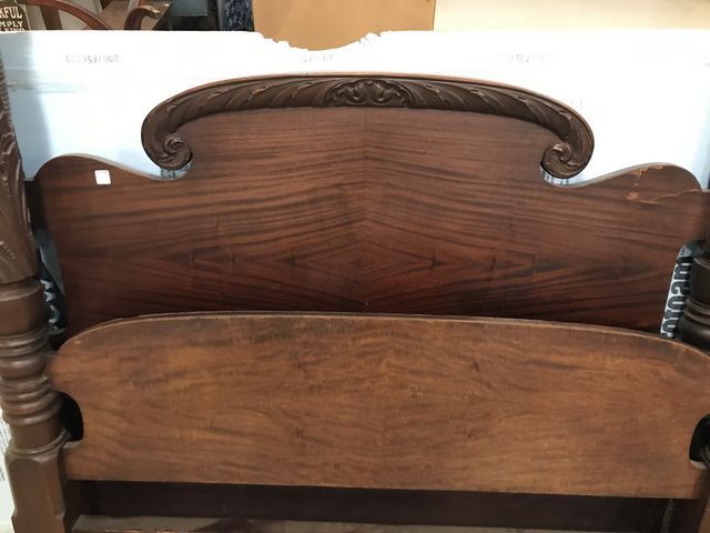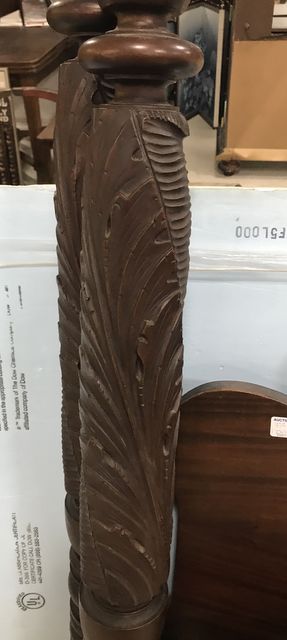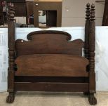 Empire Revival Mahogany Poster Bed, 1890-1905, griffin feet, acanthus carved columns, headboard feet have been re paired, wood rails, burl finish, 55"w., 66"h. Empire Revival Mahogany Poster Bed, 1890-1905, griffin feet, acanthus carved columns, headboard feet have been re paired, wood rails, burl finish, 55"w., 66"h.