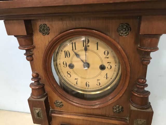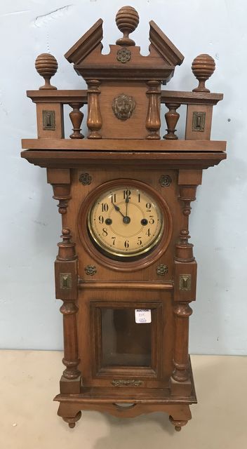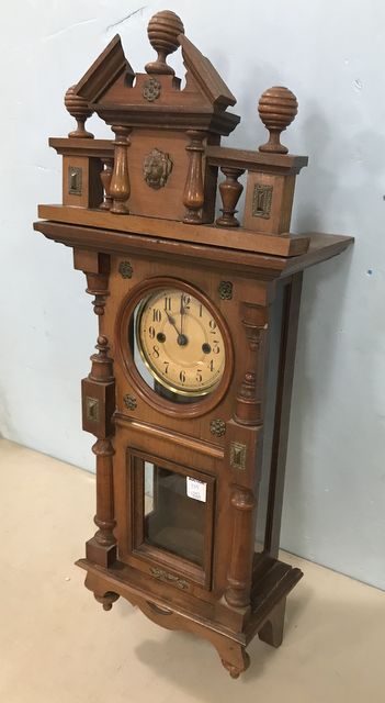 Antique Jon Schonpflug German Wall Clock, has crest, missing trim piece, missing pendulum and key, 29"h. Antique Jon Schonpflug German Wall Clock, has crest, missing trim piece, missing pendulum and key, 29"h.