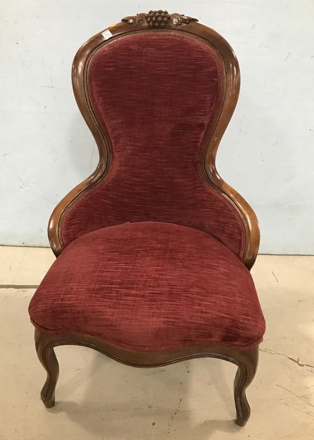 Victorian style Mahogany Parlor Chair, red upholstery, carved grapes crest, good condition. Victorian style Mahogany Parlor Chair, red upholstery, carved grapes crest, good condition.