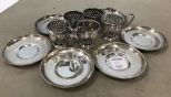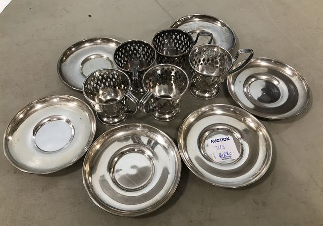 Sterling Cups and Saucers, cups missing glass lining 1 3/4"h., 6 sterling saucers 3 1/2"dia. Sterling Cups and Saucers, cups missing glass lining 1 3/4"h., 6 sterling saucers 3 1/2"dia.