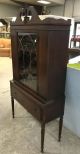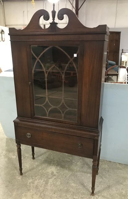 Vintage Single Door Mahogany China Cabinet, glass door, two wood shelves, single drawer, broken pediment crest, average/good condition, has some light wear, missing one piece of trim right side of drawer, 75"h., 38"w., 15"d. Vintage Single Door Mahogany China Cabinet, glass door, two wood shelves, single drawer, broken pediment crest, average/good condition, has some light wear, missing one piece of trim right side of drawer, 75"h., 38"w., 15"d.