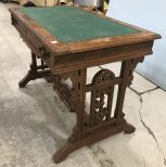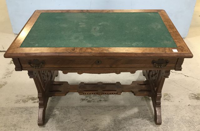 Antique Eastlake Victorian Library Table, single drawer, carved trim work, burl walnut, felt top lining, light wear for age, 29"h., 42"w., 24"d. Antique Eastlake Victorian Library Table, single drawer, carved trim work, burl walnut, felt top lining, light wear for age, 29"h., 42"w., 24"d.