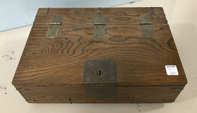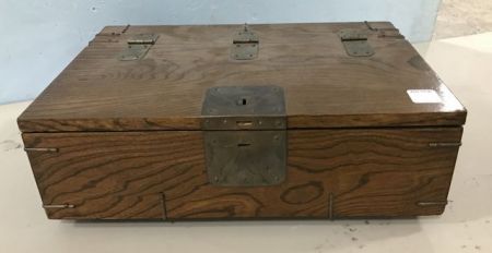 Fredrick Cooper Oriental Style Letter Box, brass hardware, made in Korea, lift top with paper lining, 5"h., 15"w., 10"d. Fredrick Cooper Oriental Style Letter Box, brass hardware, made in Korea, lift top with paper lining, 5"h., 15"w., 10"d.