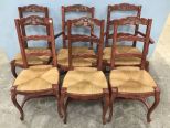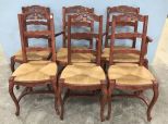 Six Vintage Country French Dining Chairs, distressed painted red with flower crest, two arms, four sides, woven seats, great condition, made in France. Six Vintage Country French Dining Chairs, distressed painted red with flower crest, two arms, four sides, woven seats, great condition, made in France.