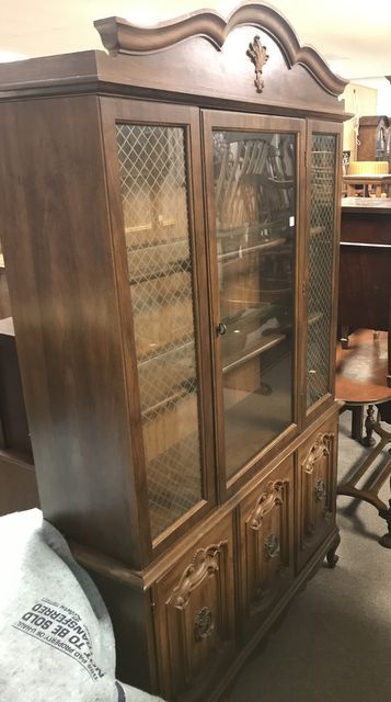 French Provincial Style China Cabinet, single glass door, mesh glass side panels, glass shelves, lighted, three bottom doors, 79"h., 46"w., 14"d French Provincial Style China Cabinet, single glass door, mesh glass side panels, glass shelves, lighted, three bottom doors, 79"h., 46"w., 14"d