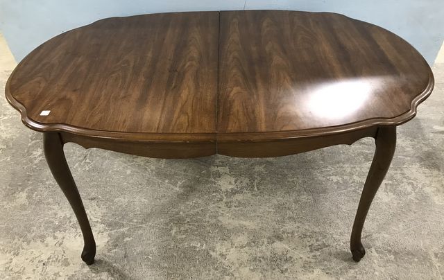 French Provincial Style Dining Table, oval turtle top style, four legs, one leaf, light scuffs on top, 29"h. 62"long., 42"w. French Provincial Style Dining Table, oval turtle top style, four legs, one leaf, light scuffs on top, 29"h. 62"long., 42"w.