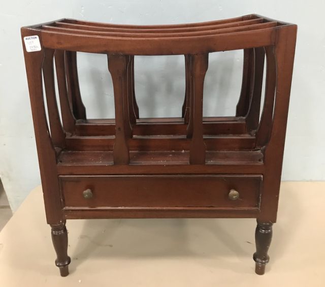 Antique Reproduction Canterbury Magazine Rack, single drawer, made in Indonesia, 20"h., 18"w., 11"d. Antique Reproduction Canterbury Magazine Rack, single drawer, made in Indonesia, 20"h., 18"w., 11"d.