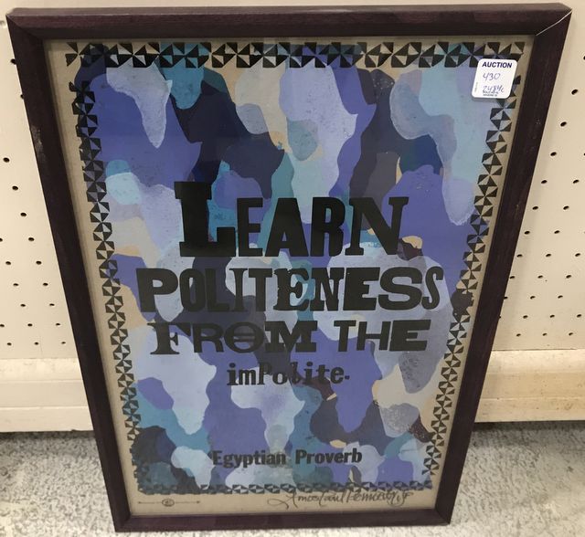 Amos Paul Kennedy Poster Art "Learn Politeness From The ImPolite", signed, frame is 20"h., 13"w. American printer, book artist and papermaker best known for social and political commentary, Detroit, MI Amos Paul Kennedy Poster Art "Learn Politeness From The ImPolite", signed, frame is 20"h., 13"w. American printer, book artist and papermaker best known for social and political commentary, Detroit, MI