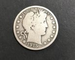 1915-D Barber Half Dollar, good condition circulated. 1915-D Barber Half Dollar, good condition circulated.