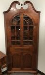 Chippendale Style Mahogany Corner Cabinet,Broken Pediment Crest, double glass door with two wood shelves, double bottom doors, light wear at base, 84"h., 40"w. Chippendale Style Mahogany Corner Cabinet,Broken Pediment Crest, double glass door with two wood shelves, double bottom doors, light wear at base, 84"h., 40"w.