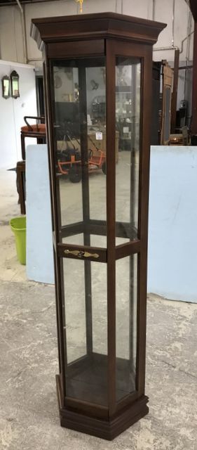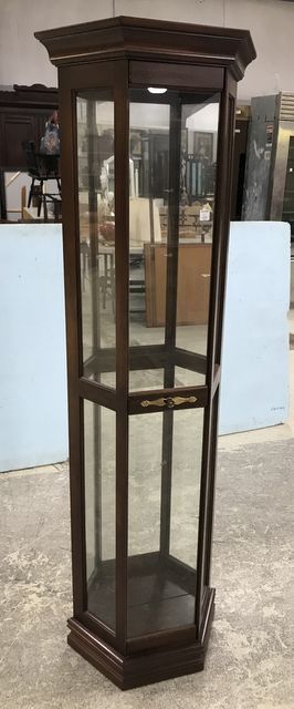 Modern Cherry Single Door Curio Cabinet, mirrored back, lighted, has glass shevles, 71"h., 10"d., 19"w. Modern Cherry Single Door Curio Cabinet, mirrored back, lighted, has glass shevles, 71"h., 10"d., 19"w.