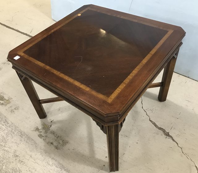 Chinese Chippendale Square Lamp Table, banded style top, modern piece, cherry, has scratches on top finish, 22"h., 27"w. Chinese Chippendale Square Lamp Table, banded style top, modern piece, cherry, has scratches on top finish, 22"h., 27"w.