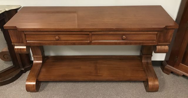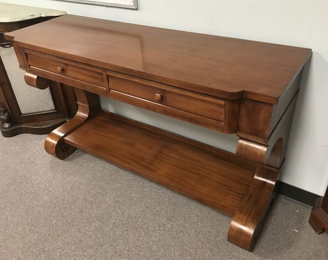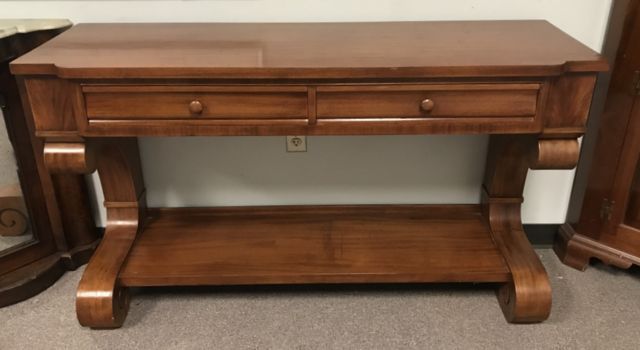 Vintage Mahogany Empire Style Wall Console Table, two drawers, two tier, empire scroll legs, sides has finish wear, 33"h., 56"w., 18"d. Vintage Mahogany Empire Style Wall Console Table, two drawers, two tier, empire scroll legs, sides has finish wear, 33"h., 56"w., 18"d.