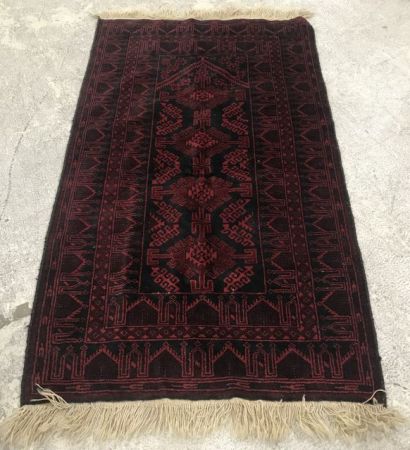 Hand Woven Belutch Afghan Wool Rug, dark colors, good condition, 2'9 x 5'. Hand Woven Belutch Afghan Wool Rug, dark colors, good condition, 2'9 x 5'.