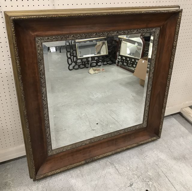 Large Wood Frame Wall Mirror, beveled, painted antique gold color frame, 43"h., 42"w. Large Wood Frame Wall Mirror, beveled, painted antique gold color frame, 43"h., 42"w.