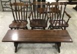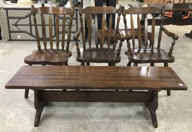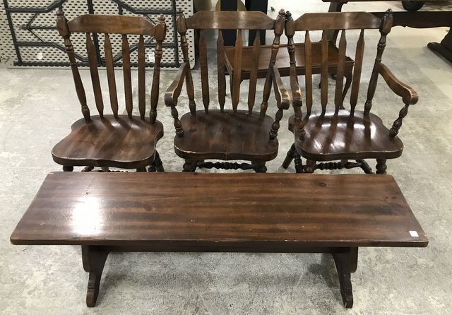 Vintage Pine Farm Style Dining Chairs and Bench, 3 spindle back chairs, 1 side, two arms, and bench 17"h., 60"w. Exposed to mildew, matches lot 0600. Vintage Pine Farm Style Dining Chairs and Bench, 3 spindle back chairs, 1 side, two arms, and bench 17"h., 60"w. Exposed to mildew, matches lot 0600.