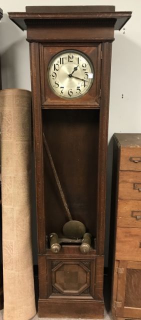 Antique English Long Case Grand Father Clock, has pendulum, two weight with chains, missing glass door, needs works, 77"h., 17"d. Antique English Long Case Grand Father Clock, has pendulum, two weight with chains, missing glass door, needs works, 77"h., 17"d.