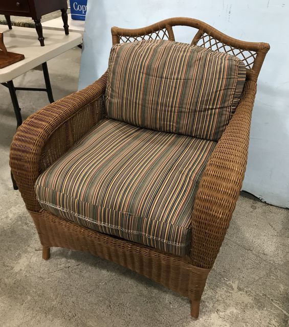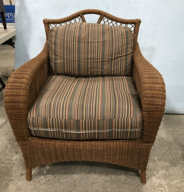 Ornate Wicker Arm Chair, with cushions, 33"h. Ornate Wicker Arm Chair, with cushions, 33"h.