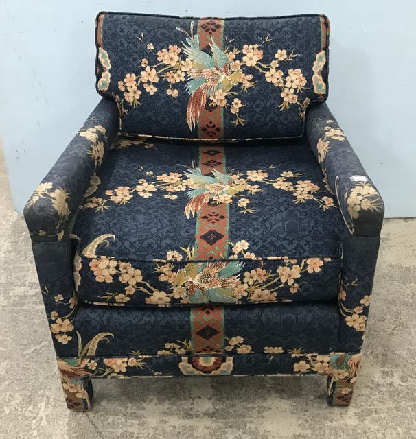 Loeblein Creations Upholstered Arm Chair, full blue upholstered Oriental Style, good condition. Loeblein Creations Upholstered Arm Chair, full blue upholstered Oriental Style, good condition.