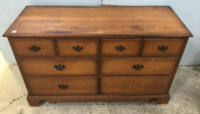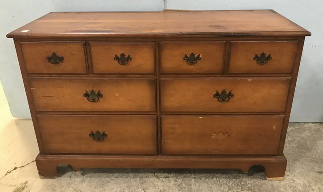 Vintage Maple Double Dresser, 6 drawers, missing pull, used, finish wear, comes with matching mirror, 32"h., 52"w., 19"d. Vintage Maple Double Dresser, 6 drawers, missing pull, used, finish wear, comes with matching mirror, 32"h., 52"w., 19"d.