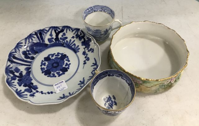 Limoges Porcelain Bowl, and Blue and White Pottery, bowl, and two tea cups. Limoges Porcelain Bowl, and Blue and White Pottery, bowl, and two tea cups.