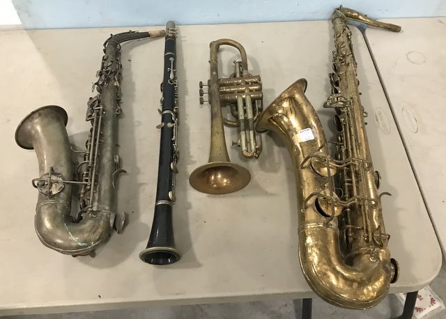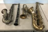 Group of Vintage Collectible Instruments, saxophones, trumpet, flute. Group of Vintage Collectible Instruments, saxophones, trumpet, flute.