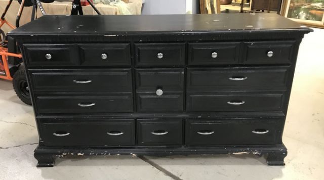 Bassett Furniture Company Painted Black Triple Dresser, painted chipping in spots, had mildew exposure, 33"h., 62"w., 20"d. Bassett Furniture Company Painted Black Triple Dresser, painted chipping in spots, had mildew exposure, 33"h., 62"w., 20"d.