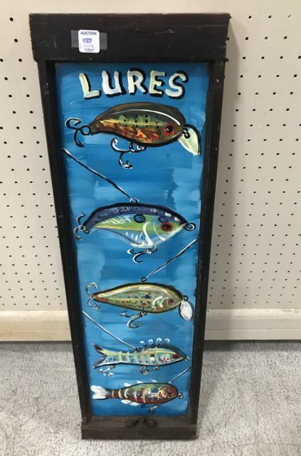 Vintage Hand Painted On Glass Fishing Lures, wood frame, 31"h., 9"w. Vintage Hand Painted On Glass Fishing Lures, wood frame, 31"h., 9"w.