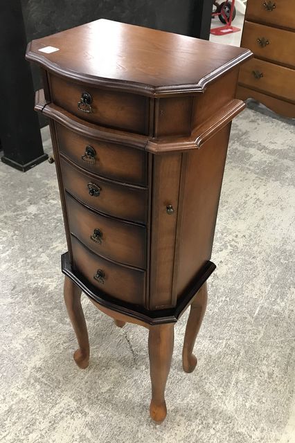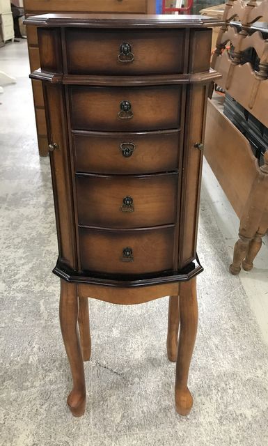 Modern Jewelry Cabinet, lift top, sides doors, five center drawers, pressed wood, 37"h., 13"w. Modern Jewelry Cabinet, lift top, sides doors, five center drawers, pressed wood, 37"h., 13"w.