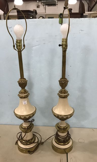 Pair of French Provincial style Lamps, painted white and brass, no shades, 40"h. Pair of French Provincial style Lamps, painted white and brass, no shades, 40"h.