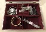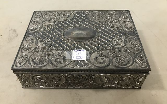 Ornate Metal Jewelry Box, monogrammed, red felt lining, has several pieces on costume jewelry. Ornate Metal Jewelry Box, monogrammed, red felt lining, has several pieces on costume jewelry.