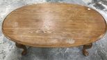 Oak Finish Oval Coffee Table, Queen Anne Style, 1980's, single drawer, exposed to mildew, 16"h., 45"w. Oak Finish Oval Coffee Table, Queen Anne Style, 1980's, single drawer, exposed to mildew, 16"h., 45"w.