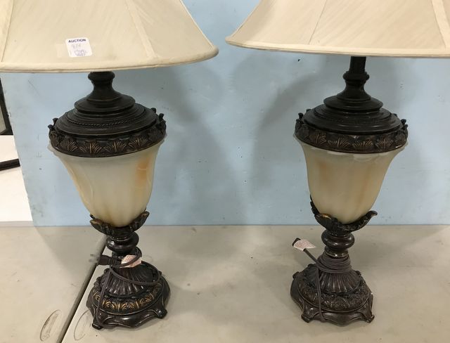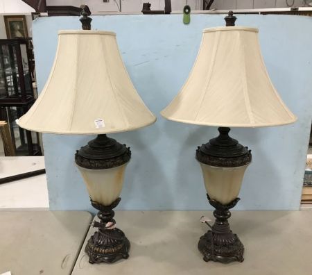 Pair of Modern Urn Style Lamps, metal frame with center night light, with shades, 34"h. Pair of Modern Urn Style Lamps, metal frame with center night light, with shades, 34"h.