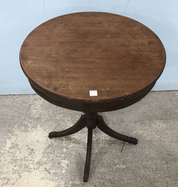 Vintage Round Top Drum Table, Needs work, missing brass claw cap, 28"h., 23"dia. Vintage Round Top Drum Table, Needs work, missing brass claw cap, 28"h., 23"dia.
