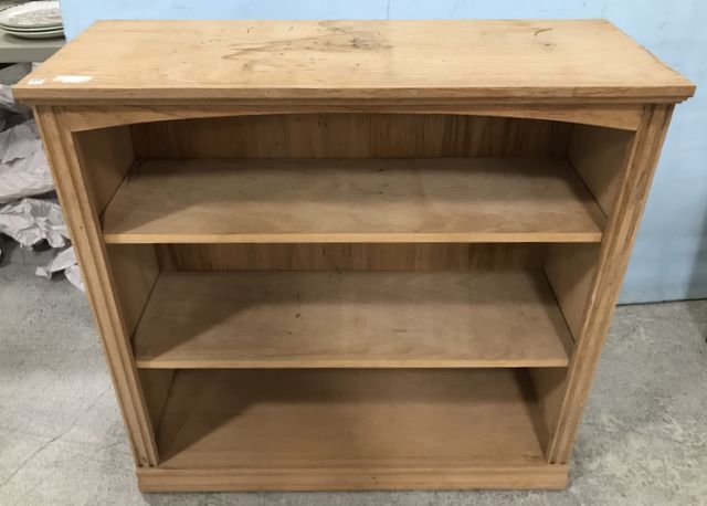 Unfinished Furniture Showcase Bookcase, two shelves, has some stains, 36"h., 36"w., 13"d. Unfinished Furniture Showcase Bookcase, two shelves, has some stains, 36"h., 36"w., 13"d.
