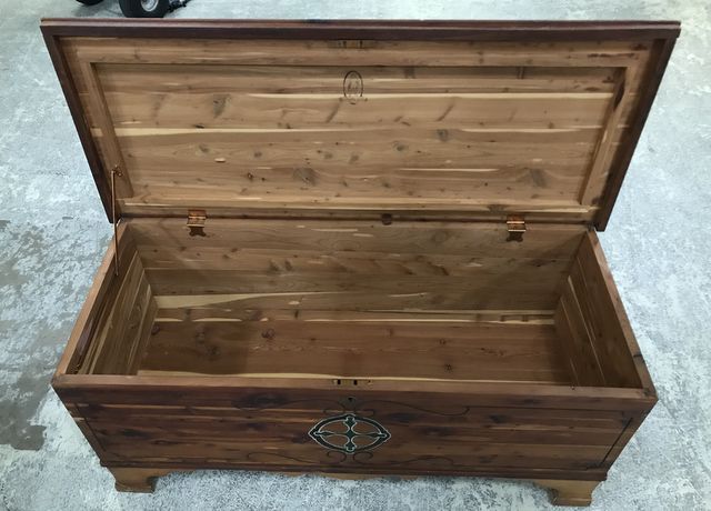 Vintage Cavalier Cedar Chest, lift top, painted center emblem, Early American style, has wear, exposed to mildew, 18"h., 44"w., 18"d. Vintage Cavalier Cedar Chest, lift top, painted center emblem, Early American style, has wear, exposed to mildew, 18"h., 44"w., 18"d.