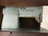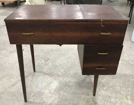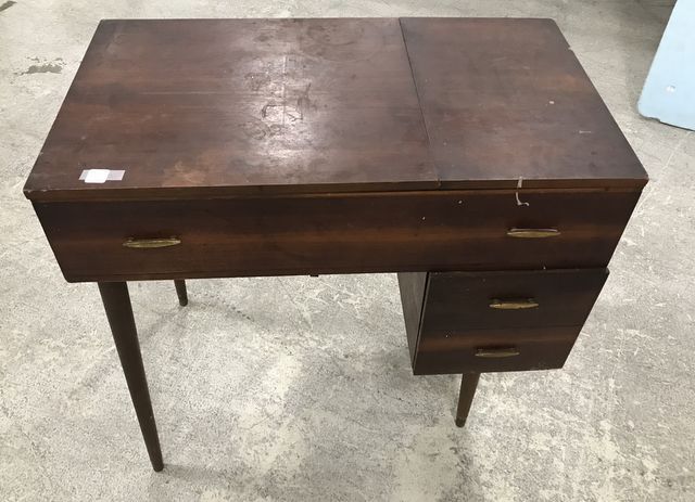 Vintage Mid Century Sewing Cabinet, with singer sewing machine, has wear, 31"h., 32"w., 17"d. Vintage Mid Century Sewing Cabinet, with singer sewing machine, has wear, 31"h., 32"w., 17"d.