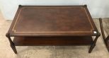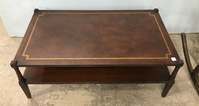 Vintage Mahogany Two Tier Coffee Table, faux leather top, 14"h., 40"w., 23"d. Vintage Mahogany Two Tier Coffee Table, faux leather top, 14"h., 40"w., 23"d.