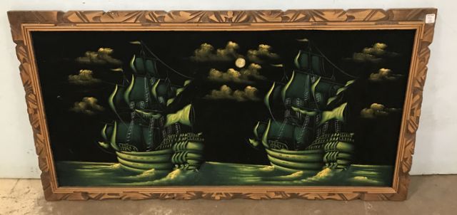 Felt painting of ships, wood carved frame, 26"h., 49"w. Felt painting of ships, wood carved frame, 26"h., 49"w.