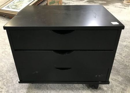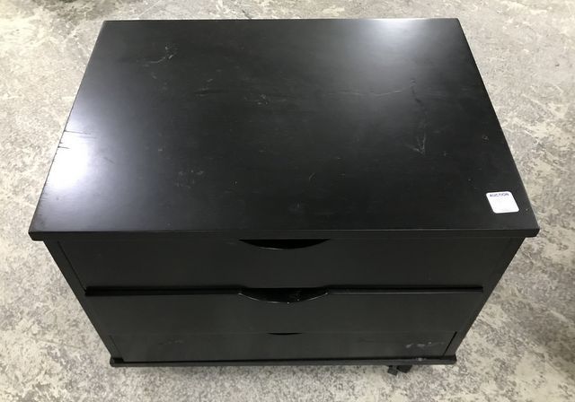 Small Modern Black Organizer Cabinet, three drawers, on wheels, 15"h., 19"w. Small Modern Black Organizer Cabinet, three drawers, on wheels, 15"h., 19"w.