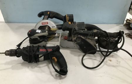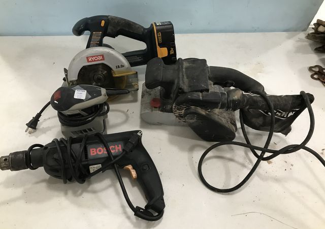 RYOBI battery caw, hand sander, Bosch drill, Craftsman sander. RYOBI battery caw, hand sander, Bosch drill, Craftsman sander.