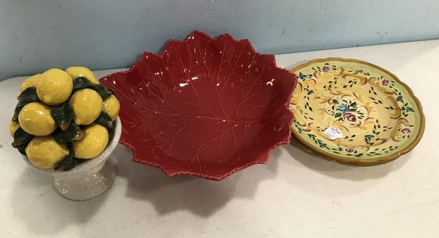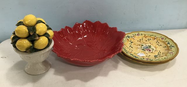 Red Leaf style serving bowl, two decorative plates, and ceramic flower planter. Red Leaf style serving bowl, two decorative plates, and ceramic flower planter.