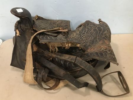 Antique Damaged Saddle, has a lot of wear and damage. Antique Damaged Saddle, has a lot of wear and damage.