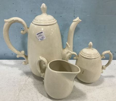 McLain Hand Made Pottery Tea Set, ceramic, pitcher 10"h, creamer and sugar. McLain Hand Made Pottery Tea Set, ceramic, pitcher 10"h, creamer and sugar.