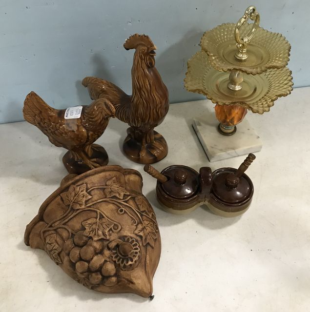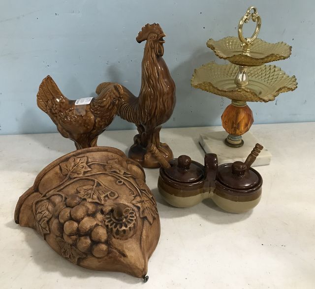 Vintage Glass Two Tier Pedestal, Pottery Wall Urn, Two Rosters (one has chip), and Jellys Vintage Glass Two Tier Pedestal, Pottery Wall Urn, Two Rosters (one has chip), and Jellys