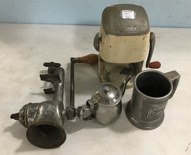 Vintage Kitchen Accessories, Ice o Mat, Meat grinder, United State Postage mug, silver plate pitcher. Vintage Kitchen Accessories, Ice o Mat, Meat grinder, United State Postage mug, silver plate pitcher.